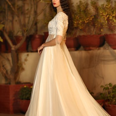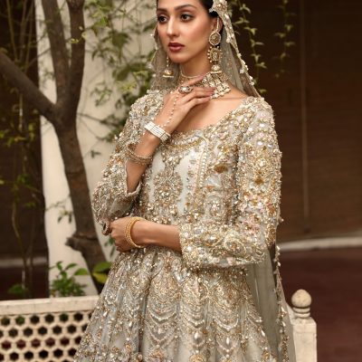 Blush Gold Radiance – Embellished Cold-Shoulder Bridal Set in Jamawar and Net