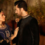 The ensemble is paired with a coral pink organza dupatta 🌸, adorned with a dense sparkling spray and finished with a 1-inch kirin lace border on all four sides for a striking touch. To complete the look, a navy blue embellished shawl 🪡 on a rich velvet base adds depth, warmth, and undeniable regality.