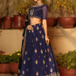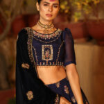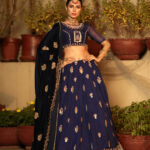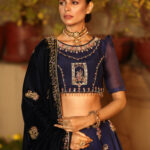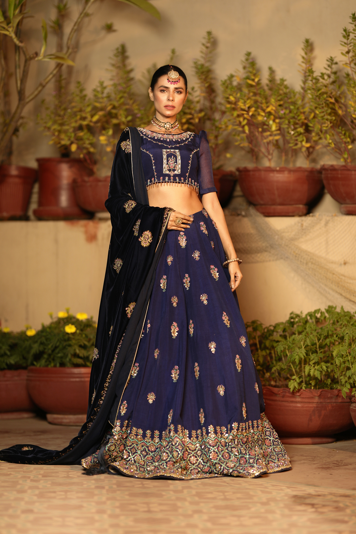 A RoyalBlue pure raw silk lehenga choli designed in contrasting hues for a look that radiates tradition with a modern edge 👑. The voluminous lehenga features a delicate hand-printed technique 🧵, further enhanced with intricately hand-rendered embellishments ✨ inspired by the grandeur of #MughalArt.